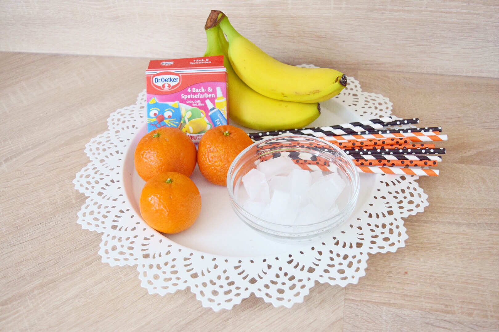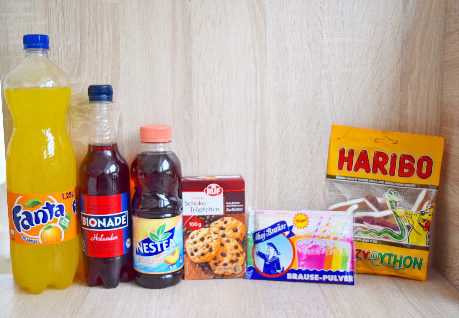 Fanta, Bionade, Eistee, Mandarinen, Bananen, Eiswürfel, Gummischlangen, Brausepulver, Schokotropfen, Strohhalme, Gläser und nach Wunsch Lebensmittelfarbe. Natürlich sind die Produkte nur ein Vorschlag von mir und ihr könnt jedes nach eurem eigenen Geschmack abhängig machen.