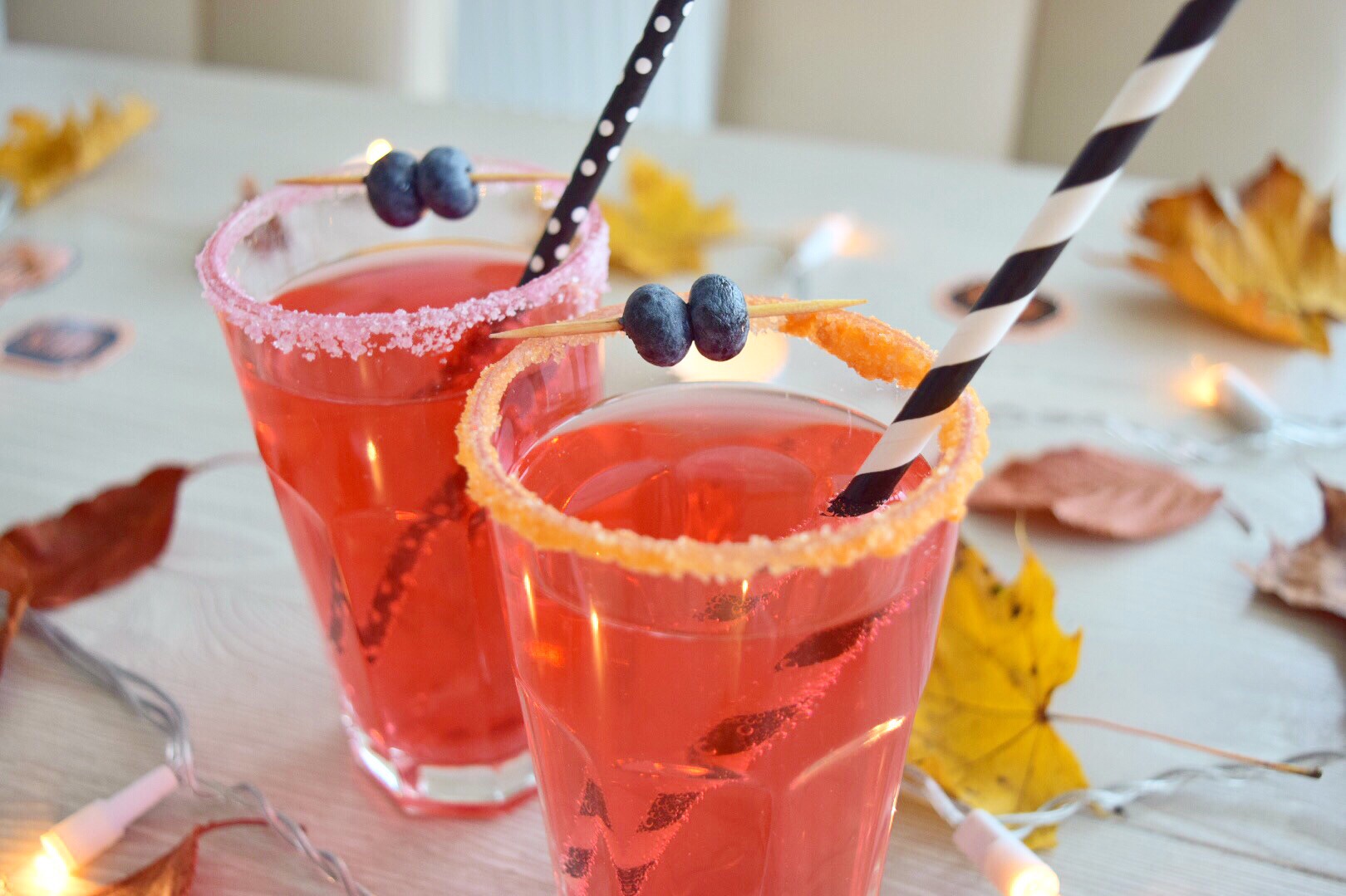 Das letzte Getränk ist ein bisschen zeitaufwendiger. Ihr braucht wieder ein Glas und befeuchtet den oberen Rand mit etwas Wasser. Anschließend gebt ihr Brausepulver darüber und füllt das Glas mit Bionade oder wieder mit Sprit Getränk mit Lebensmittelfarbe auf. Dazu habe ich nun noch Heidelbeeren und einen Strohhalm garniert.