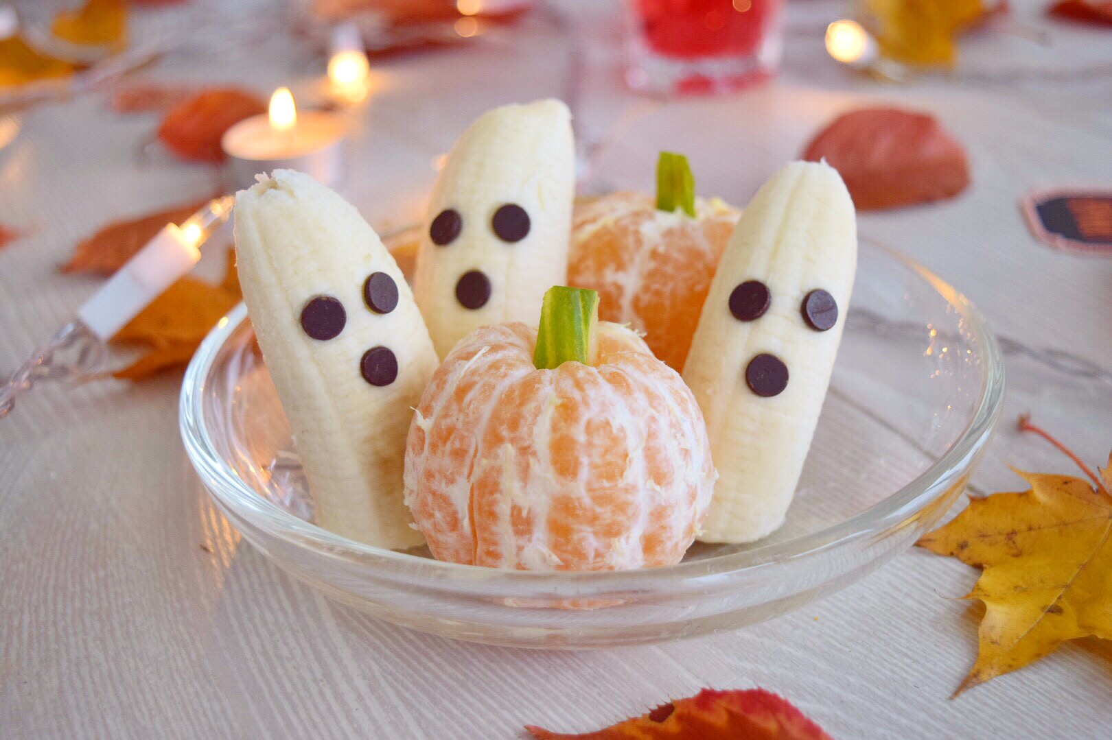 Nun kommen wir auch schon zu meinen ganz einfachen Snack Ideen. Für den Geist benötigt ihr eine Banane, schneidet diese in eure Wunschgröße und befestigt die Schoko Tropfen als Augen und Mund.