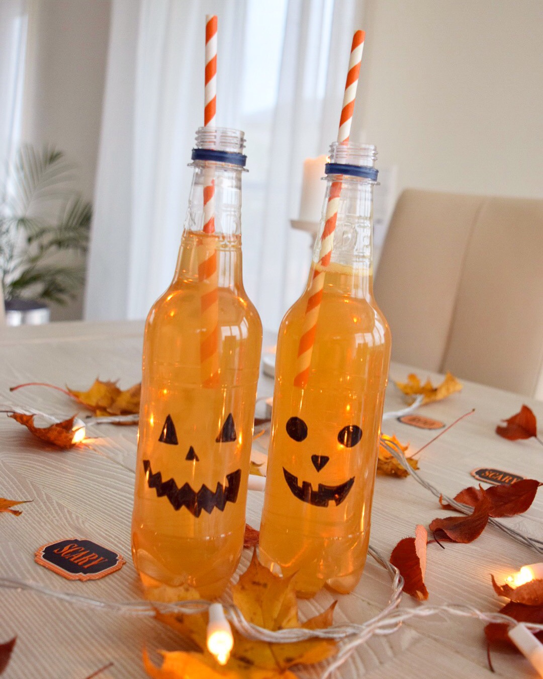 Mein erstes Getränk ist das leichteste, dafür braucht ihr nur ein Gefäß. Ich habe eine leere Falsche verwendet. Außerdem euer Fanta (oder eurer Getränk nach Wunsch) und füllt dieses in euer Gefäß. Ich habe in mein Fanta noch etwas rote Lebensmittelfarbe hinzugegeben damit es die Farbe orangen ergibt, passend für ein Kürbis. Danach könnt ihr noch zusätzlich mit witzige/bunte Strohhalme das ganze aufpeppen und die Flasche mit einem permanenten Edding ein witziges Gesicht darauf malen.