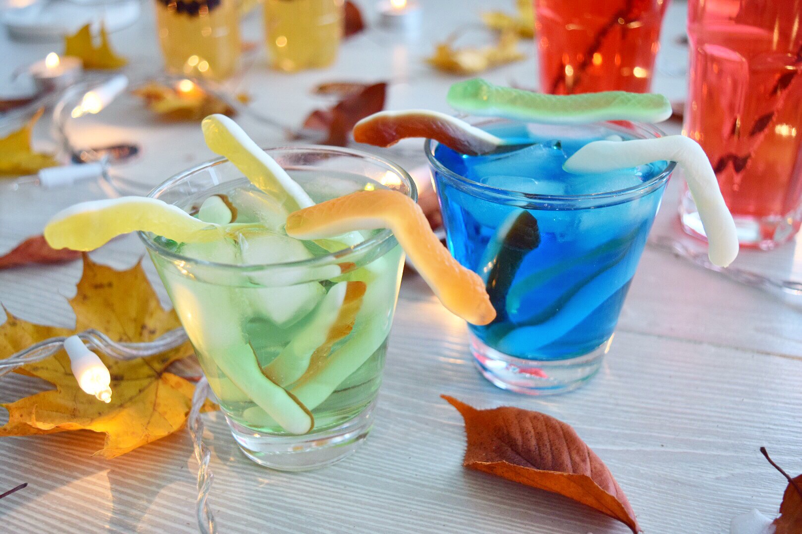 Für mein zweites Getränk benötigt ihr ein Glas, euren Eistee oder Sprit Getränk und gibt dazu eine Lebensmittelfarbe nach Wahl hinzu. Anschließende habe ich noch Eiswürfel dazu gegeben. Dann legt ihr die Gummiwürmer über die Eiswürfel oder hängt sie an die Seite hin.